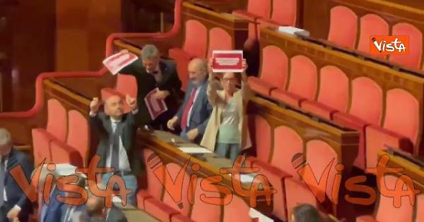 Protesta con cartelli dei senatori delle opposizioni in Aula dopo l’approvazione del Dl sicurezza. Cartelli rossi con la scritta 'Governo