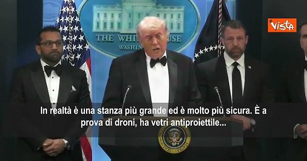 "Non è un edificio particolarmente sicuro e... non volevo dirlo, ma questo è il motivo per cui dobbiamo avere tutti gli attributi di ciò che stiamo pianificando alla Casa Bianca. In realtà è una stanza più grande ed è molto più sicura. È a prova di droni, ha vetri antiproiettile... abbiamo bisogno della sala da ballo, ecco perché i Servizi Segreti, ecco perché i militari la stanno richiedendo", così il Presidente degli Stati Uniti Donald Trump in una conferenza stampa dopo l'attentato a Washington.